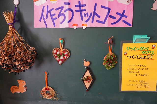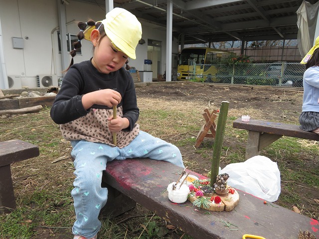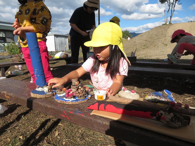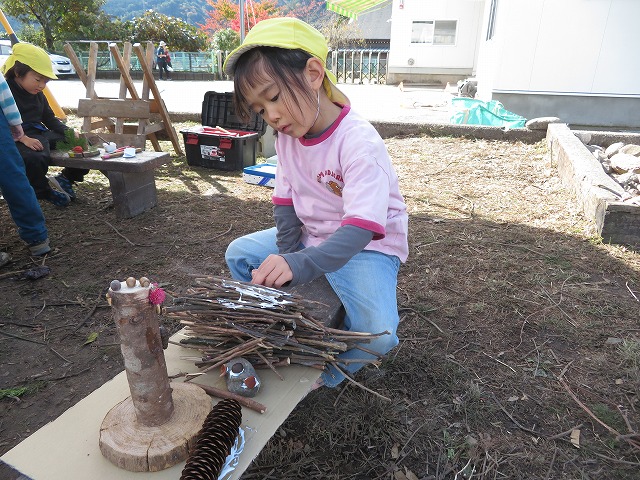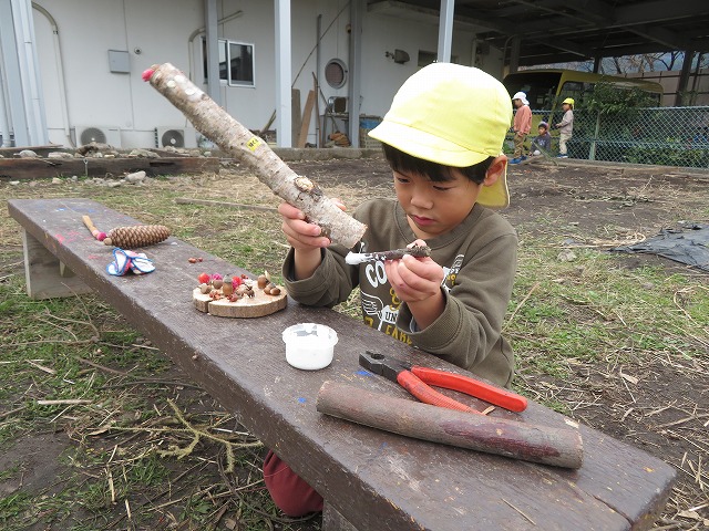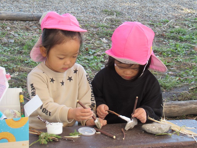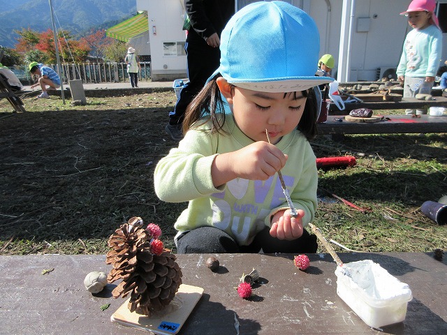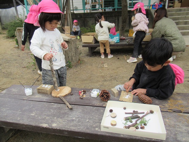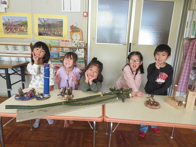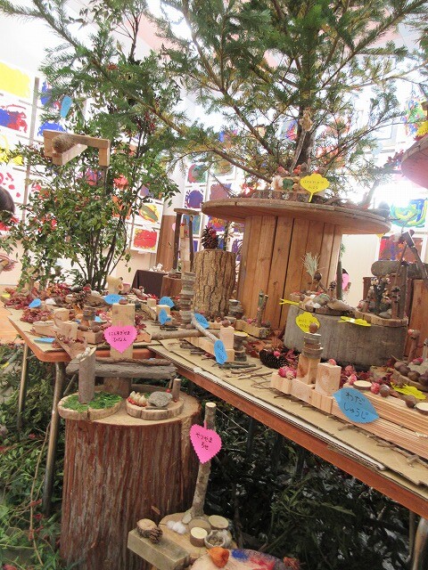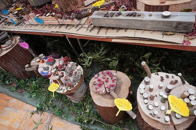 毎年 ゙木ぼっくり゙という名前で、虫や動物や人間を作っていましたが、今年はさらなる子どもの豊かな創造や表現を願って、木や木の実だけに限らず石や粘土、絵具など様々な材料も取り入れて作品作りに取り組みました。