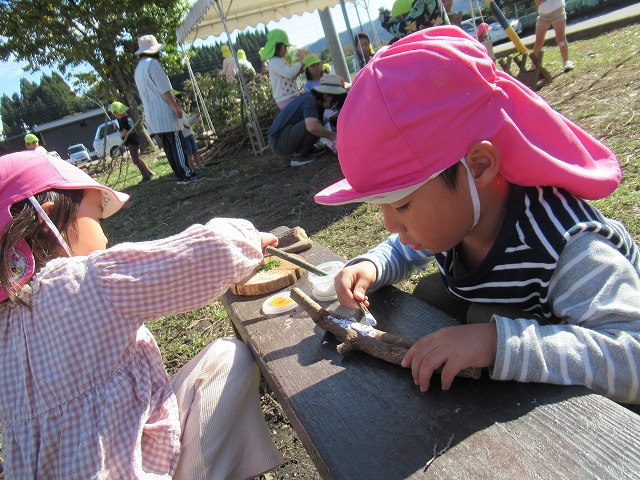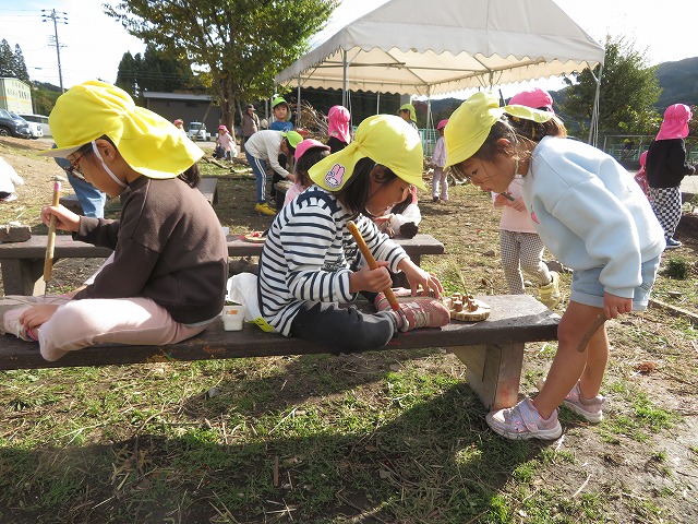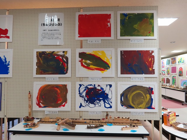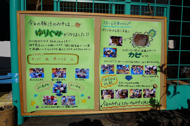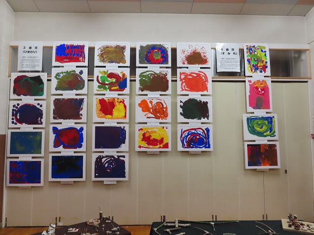 子どもたちの描いた自由画も展示し、たくさんの方に見ていただくことができ、園庭では年長の子どもたちが作った味噌を使った豚汁を、青空の下であじわっていただくこともでき、みなさんによろこんでいただけました。