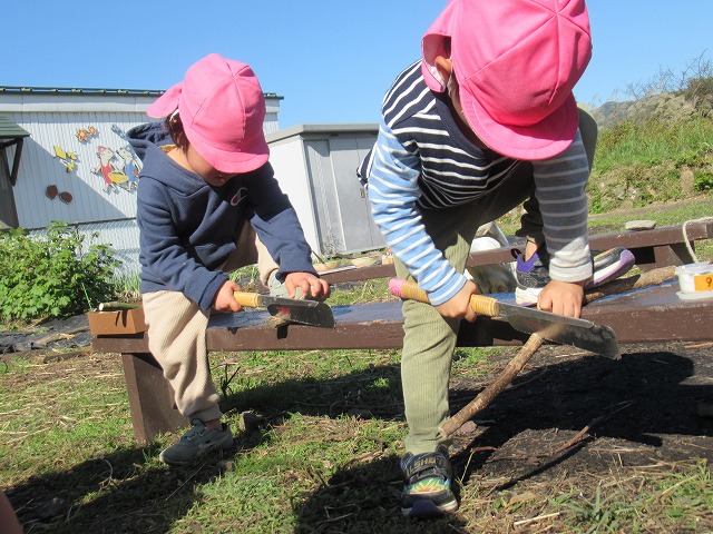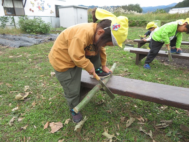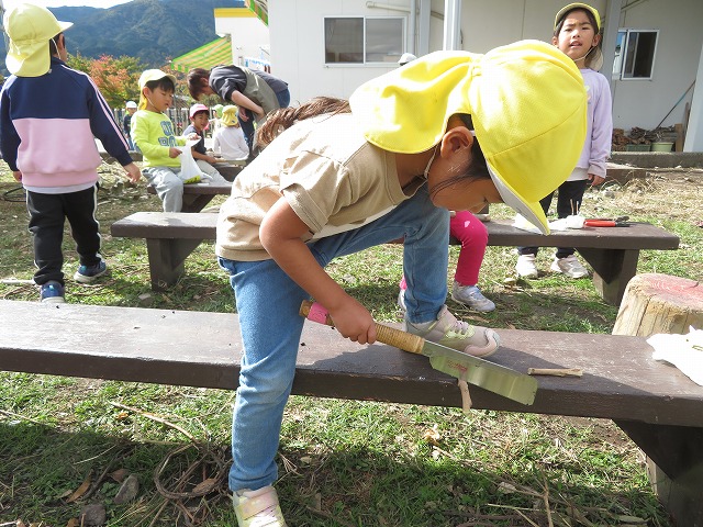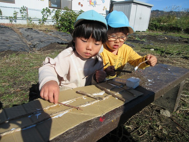年中・年長はいろいろな道具に触れることも大切にしたいと思い、木をのこぎりで切ること、キリで穴を開け針金とボンドでくっつける(ジョイント)という方法も取り入れながら作りました。