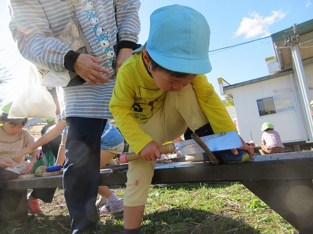 今年は白鳥町でも熊の出没が確認されており、なかなか散歩にでかけられないため、園庭に松ぼっくりやどんぐりなどの木の実などを置いて、子どもたちが自然素材にたくさん触れて遊べるようにしました。