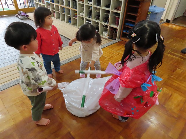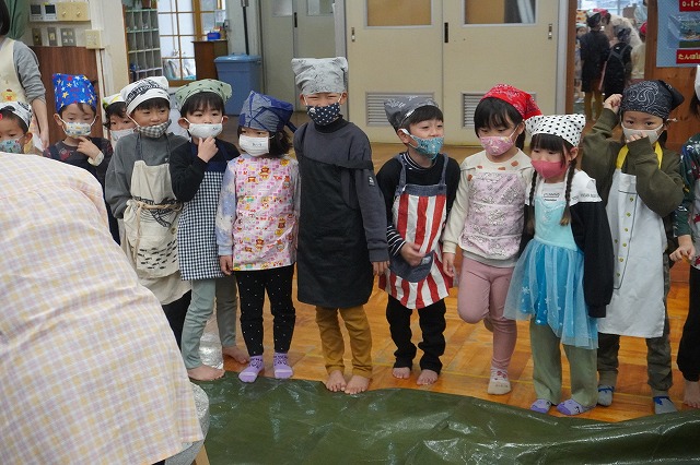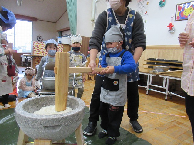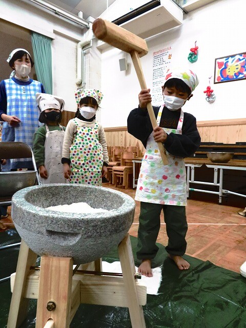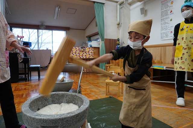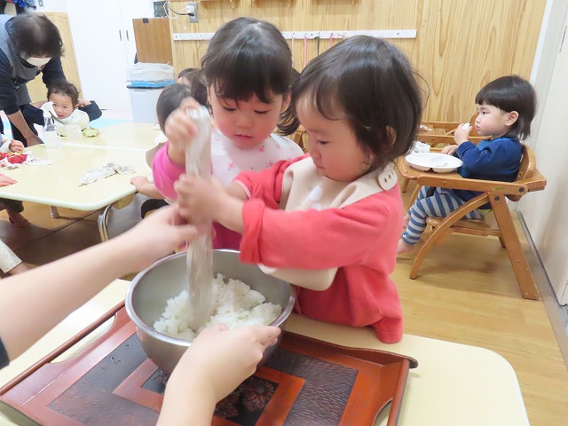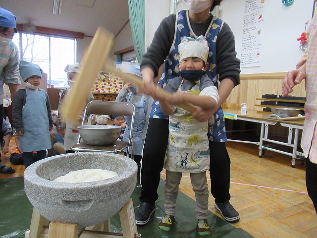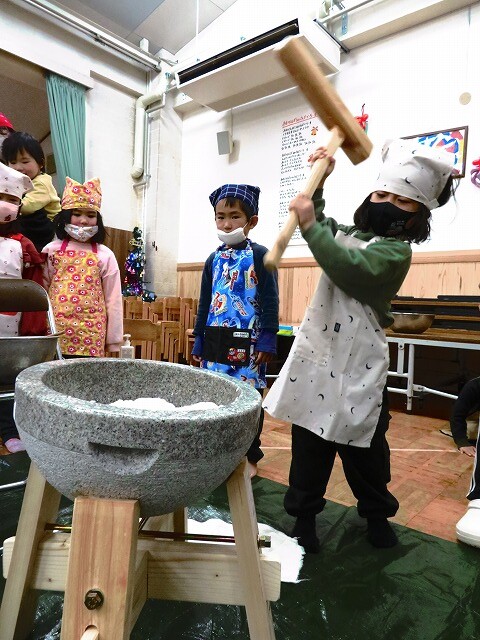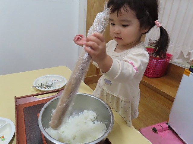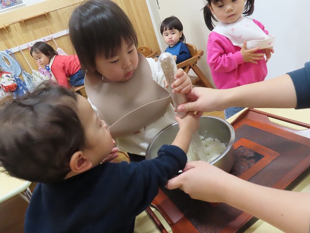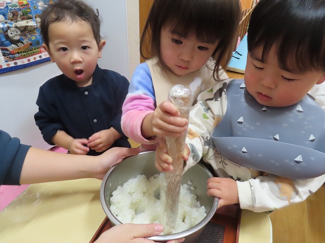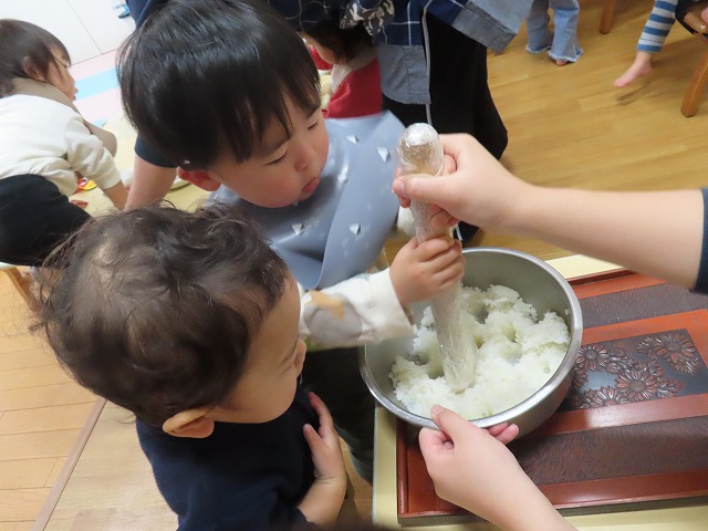 たんぽぽ組さんは、遊戯室で大きい子がお餅をついている様子を見学し、ビニール袋をお餅にみたてラップ芯でお餅つきのまねをし楽しんでいました。その後、部屋にもどり自分たちが食べる「ごはん餅」を一生懸命つきました。自分で作ったお餅はとっても美味しくて、何度もおかわりして食べる姿が見られました。